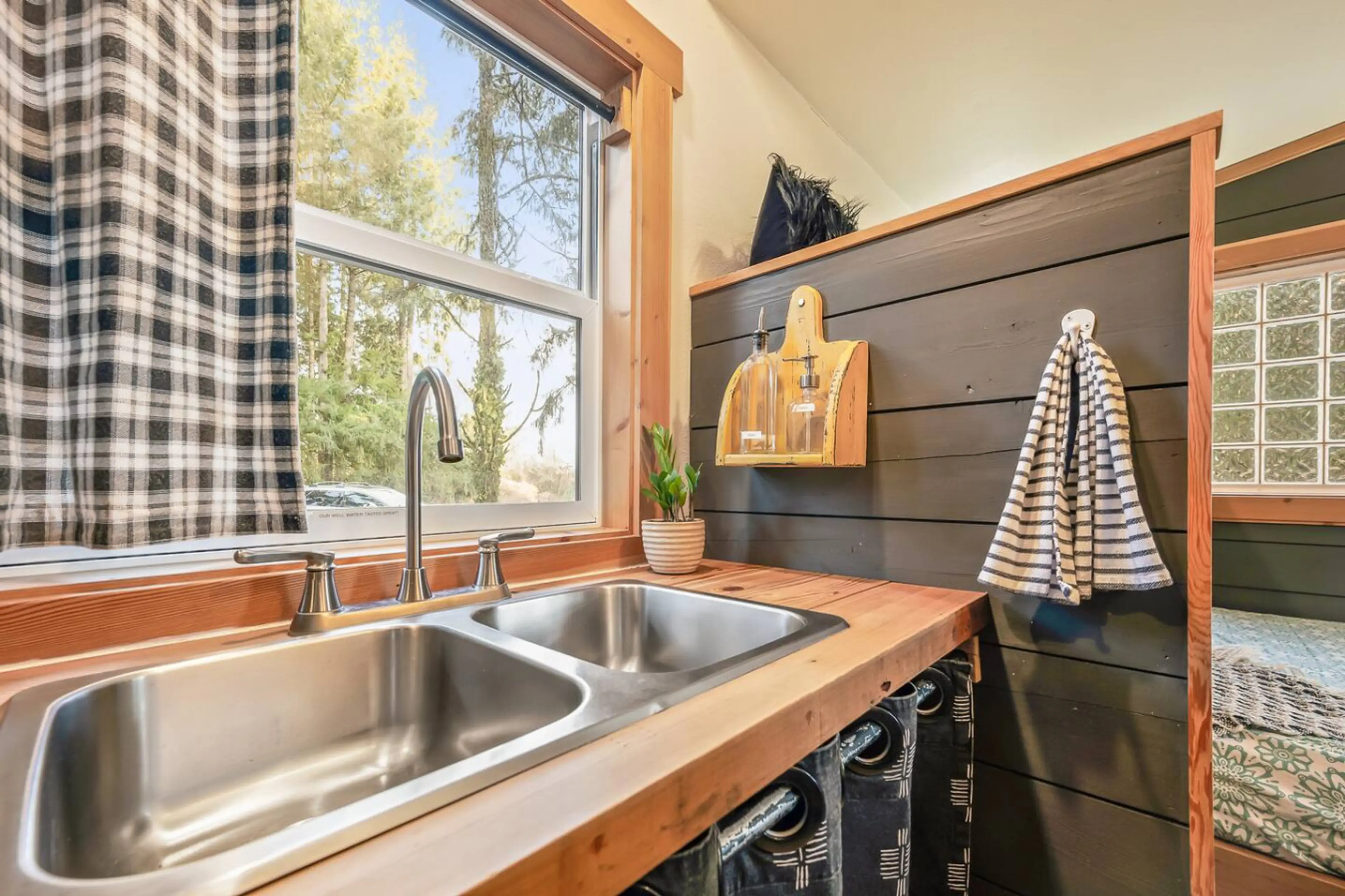 When guests aren’t exploring local wineries or hiking waterfalls, they’re unwinding; lounging at the picnic table, strolling with their pup, or cozying up with a book from our unique library. This bright and stylish tiny space has it all: two comfy beds, a refreshing open-air shower, generous counte...